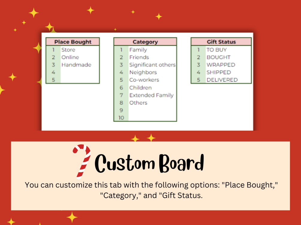 π Status Monitoring: Keep tabs on the status of each gift β from ideas and purchases to wrapping and delivery. With our Kanban board layout, you'll have a clear visual representation of where each gift stands in the gifting process.